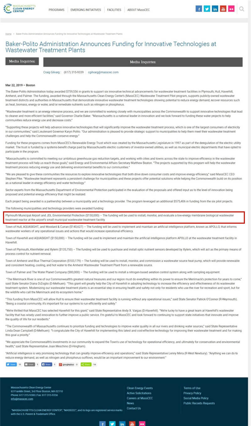 In March 2018, Massachusetts, as a global clean energy center, publicly sought proposals for innovative cutting-edge wastewater treatment technologies around the world to conduct technical pilots in Massachusetts. After a year of rigorous selection and evaluation, in March 2019, JDL’s FMBR technology was selected as the technology for the Plymouth Municipal Airport pilot WWTP project.